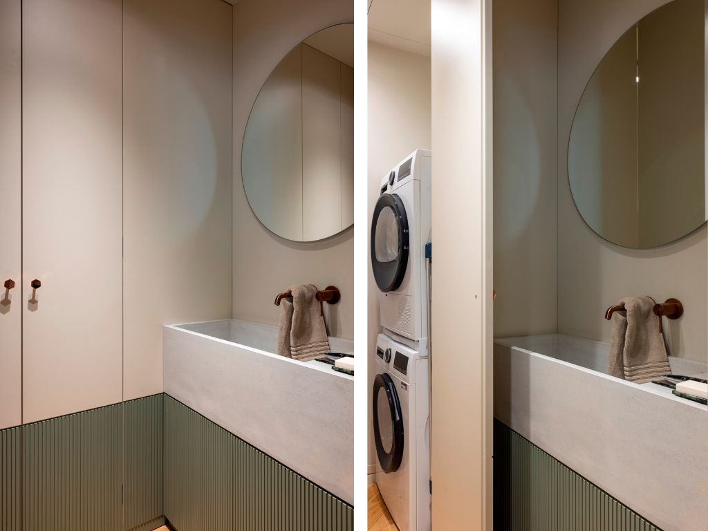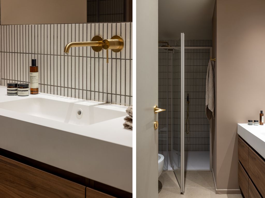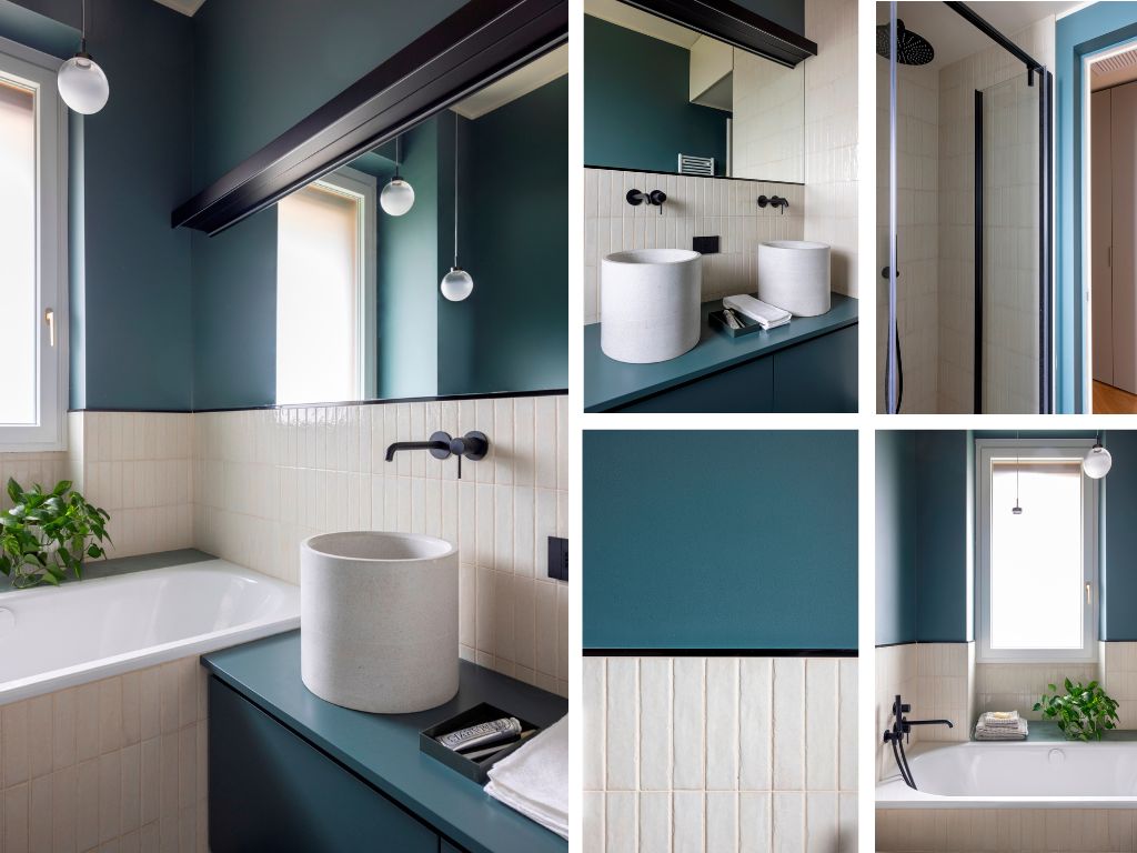Il bagno padronale è dotato di una doccia walk-in, che combina praticità e modernità. La zona dei bambini è distribuita lungo un corridoio secondario su cui affacciano le camere e il bagno, progettato su misura, come il lavabo interamente in cemento che conferisce un tocco moderno.