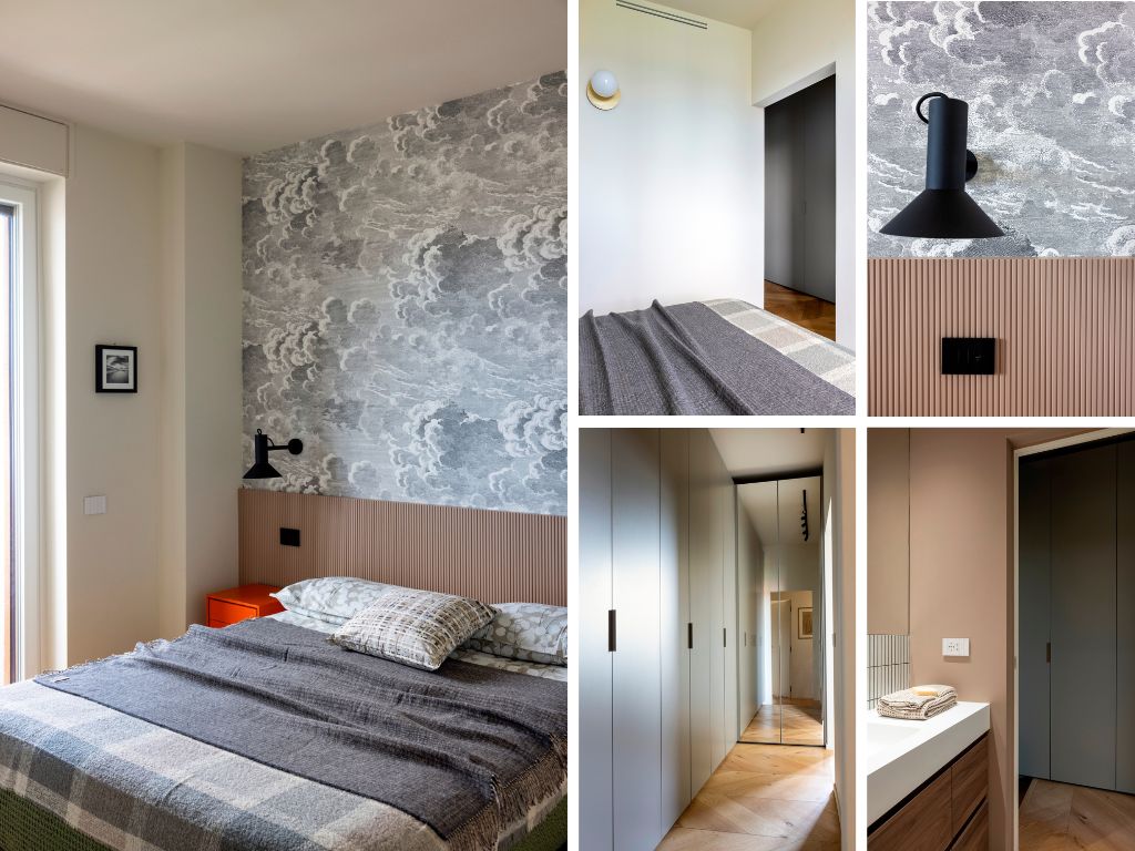 Alla camera principale si accede passando dalla cabina armadio, creando una sorta di corridoio che anticipa la camera.
