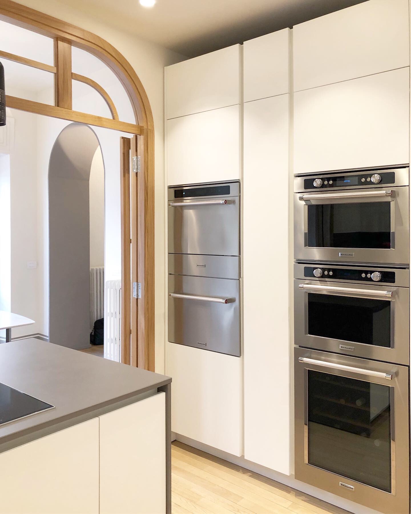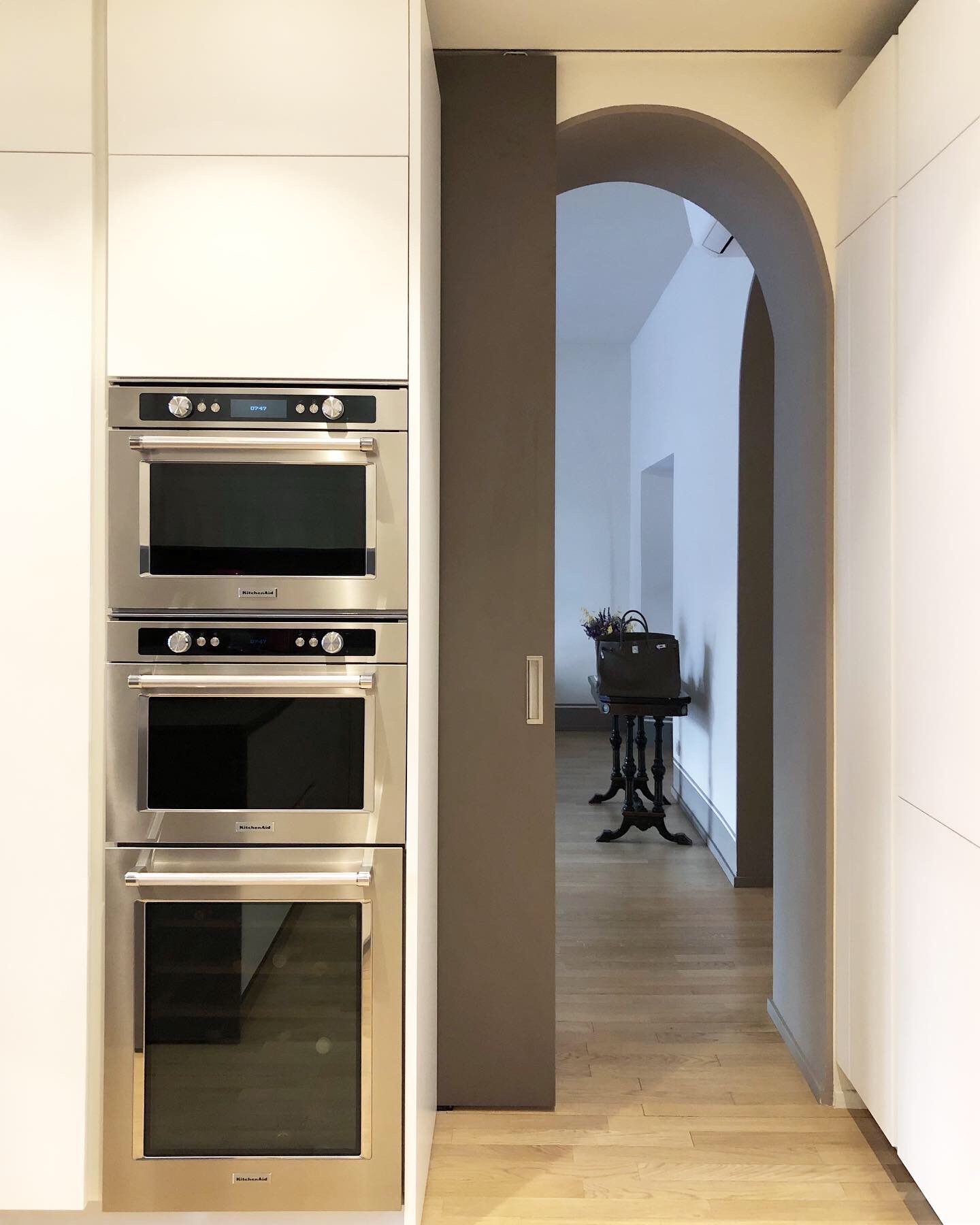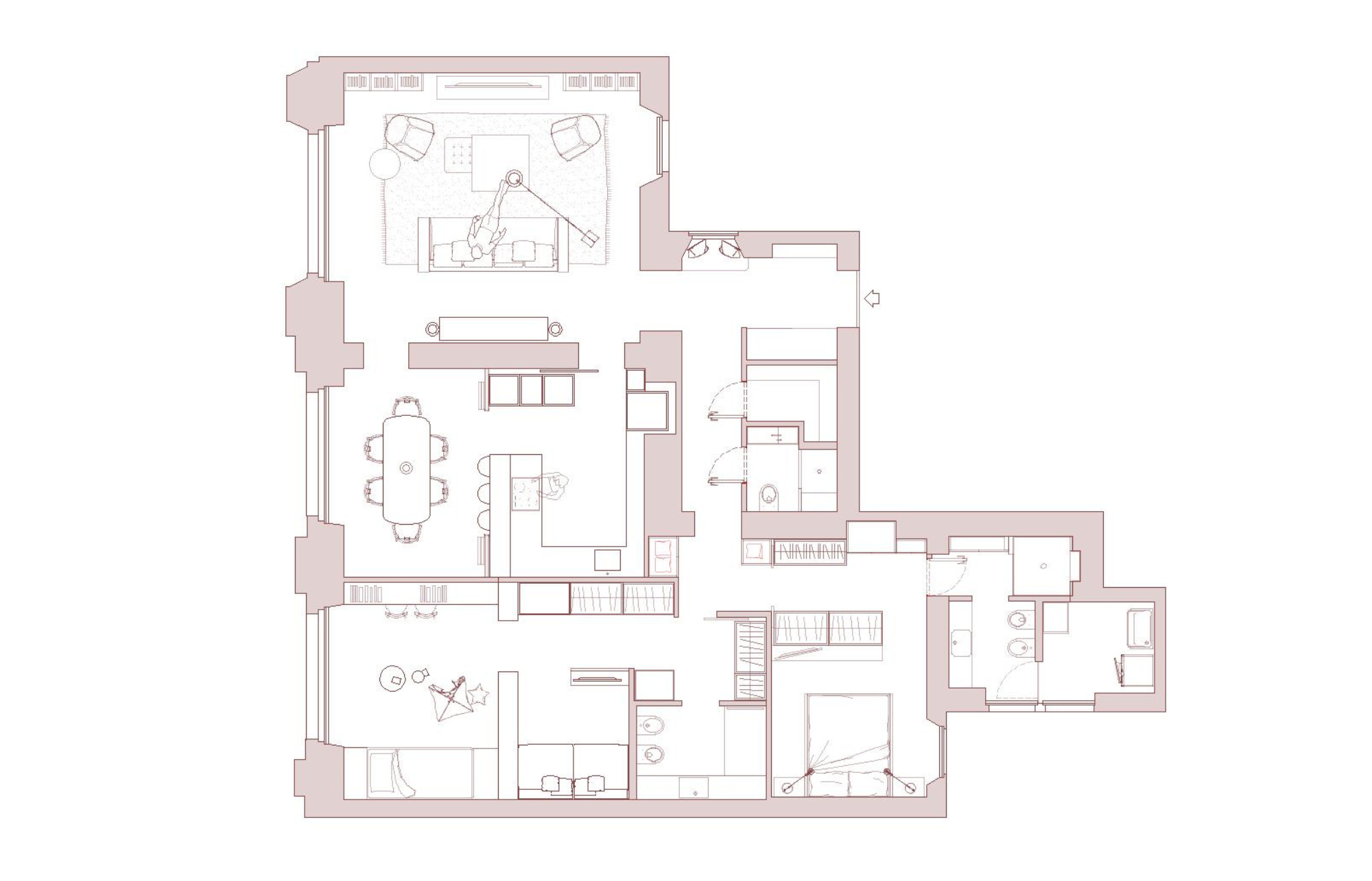 Abitazione progettata a Milano che rispecchia pienamente le esigenze dei clienti, che richiedevano un’attenzione particolare alla funzionalità, all’estetica e alla fluidità dello spazio, mantenendo però le qualità originarie dell’abitazione. All’ingresso, si trova un’elemento funzionale: un mobile contenitivo che, oltre alla sua praticità, maschera le porte che introducono ai vari spazi della casa. A destra si apre la zona giorno, mentre a sinistra si sviluppa la zona notte.